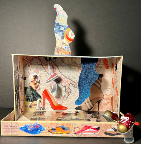 Lynne's preferred method of making visual art is mixed media collage. She works spontaneously without preconceived ideas by juxtaposing incongruous images of nature, architecture, and landscapes. More recently Lynne has been incorporating bits of her own old photographic prints. She often uses trompe l'oeil techniques to integrate elements of the composition and sometimes adds found objects, recycled materials, wire, beads, string, etc.